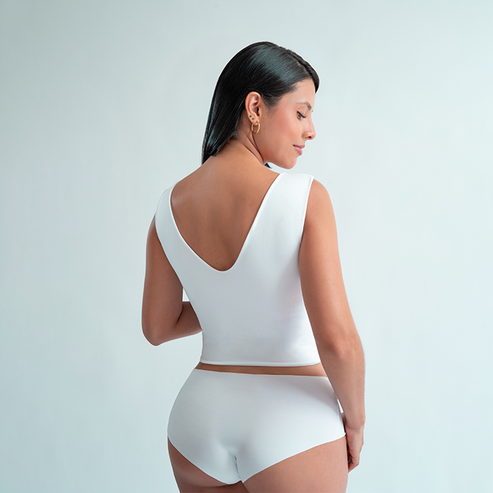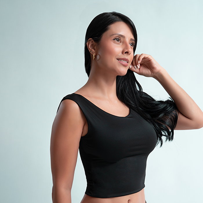 Su tela elástica de alta suavidad se adapta al cuerpo brindando soporte ligero y una sensación de segunda piel. El corte recto y las mangas amplias aportan libertad y estilo, haciéndolo ideal para usar como prenda interior o complemento de looks casuales.
